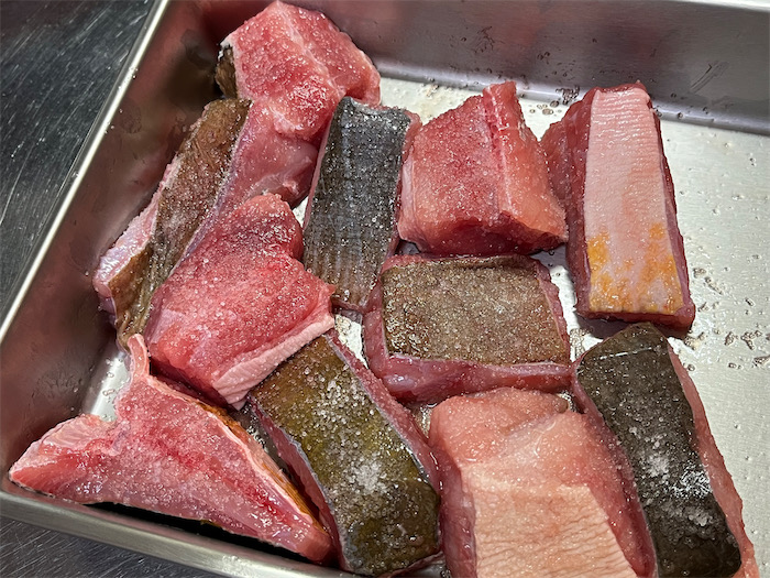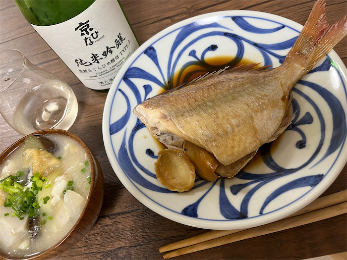 ◆いずれにしても、めでたいお祭りの夜なので、今宵の〈みなか食堂・道後店〉は「鯛の炊いたん」をご用意しました。アタマを落とした200gの下灘の天然鯛が2尾350円。鯛を炊くのはひさしぶり。