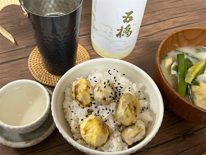 常連客からは「燗酒になってもアテが変わり映えしない」とのクレームあり。ふふふ、〈みなか食堂〉でそんな粗相をするわけがない。道後樋又でいただいた丹波栗の土鍋ごはんと西条〈らいえいファーム〉の青ねぎと大洲の里芋そして松山揚げの麦味噌汁がちゃんとあるんです。岩国〈五橋〉の「生酛90」を熱燗でどーぞ。