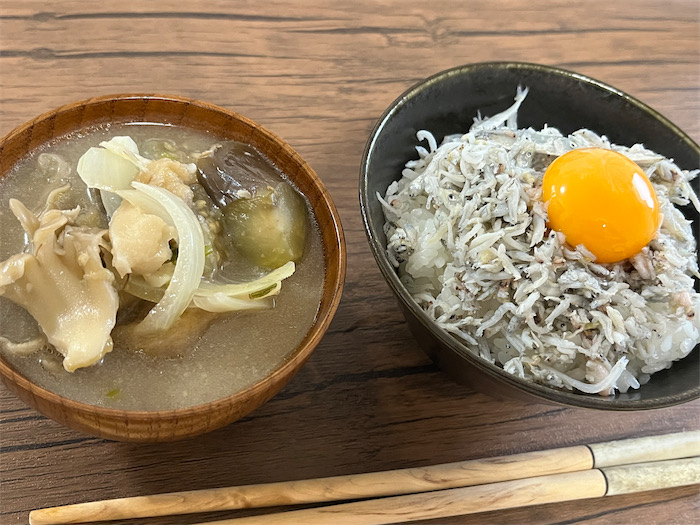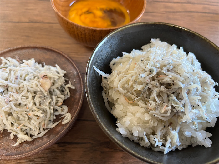 ◆〈みなか食堂・道後店〉の朝餉はいつもはパンなのだが、多少寒くなってきたので、炊きたてご飯もよかろうと今朝は土鍋で白米を炊いた。氷温室の釜揚げしらすは足が早く今日が賞味期限。卵も追加したので、堂々たる “勇気の出る朝ごはん” の一丁上がり。
