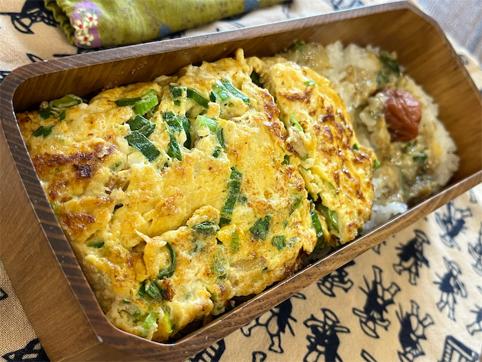 ◆しかし、たとえ寝過ごしてもすぐつくれるのが “勇気の出るお弁当” 。今朝は函館直送の燻製ほたてと西条の青ねぎを混ぜ込んだだし巻き卵が鎮座する。たったそれだけのシンプルなお弁当。