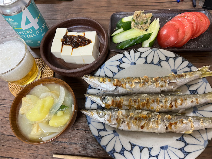 ◆夕暮れの帰り道。いつもの業務スーパーで下灘のカマスに睨まれたので連れ帰った。7尾で税込300円、1尾40円なので、今宵の〈みなか食堂・道後店〉の夕餉はキマリ。同学科の先生に新しい “醤【ひしお】” をいただいたので、さっそく冷奴にトッピング。玉ねぎとじゃがいもと松山揚げの麦味噌汁。カマスはもちろん塩焼きに。〈DD4D Brewing〉の Brut IPA「4 o'Clock Let's Call It a Day」を抜栓。