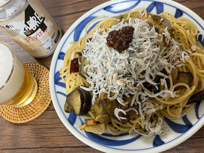 ◆道後樋又での中間試験の立ち会いやら何やらで、温泉街に帰り着いたのは午後8時近かった。今宵の〈みなか食堂・道後店〉は大学で穫れた秋茄子の醤【ひしお】風味パスタ。ビールは〈DD4D Brewing〉の Cream Ale「Flying Mamaliga」。