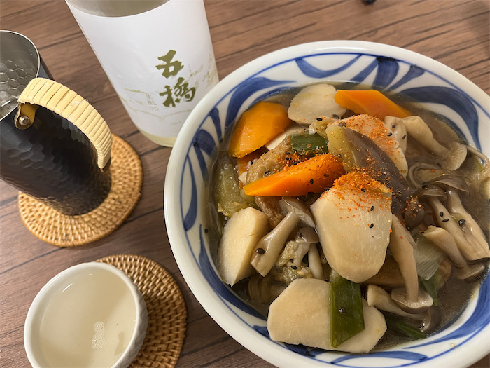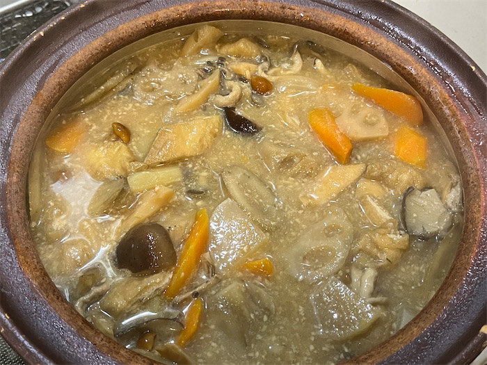 冷蔵庫の残り物野菜を総動員した汁もの。土鍋で煮干し&昆布の合わせ出汁を引いて、牛蒡・人参・馬鈴薯・大根・蓮根・椎茸・しめじ・なめこ・油揚げを投入して加熱する。酒粕・塩麹・濃口醤油で調味。一味唐辛子を振って食卓へ。