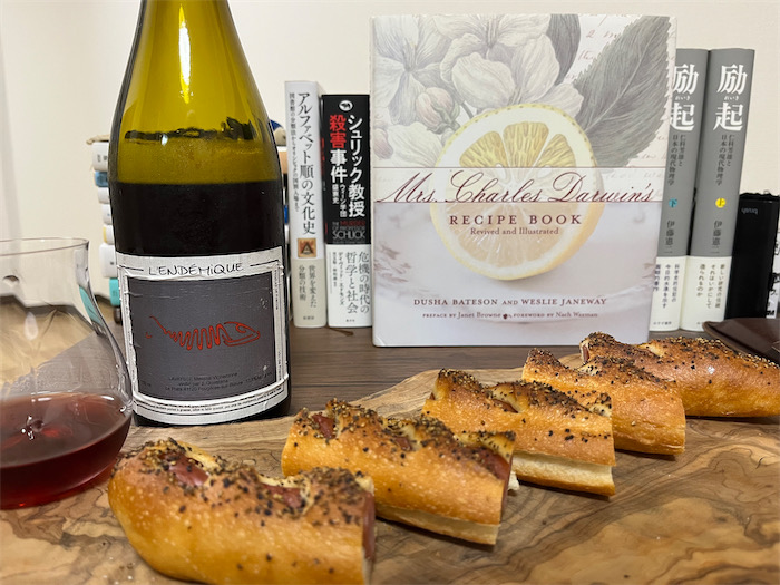 ◆いつもいつも「米の飯」ばっかり食べているので、たまにはロングソーセージパンをかじりながら赤ワインを呑んでも許されるだろう。ということで、今宵の〈みなか食堂・道後店〉は暖簾をかけず、店主が厨房でひとり呑んだくれている。こうなったら打つ手なし。
