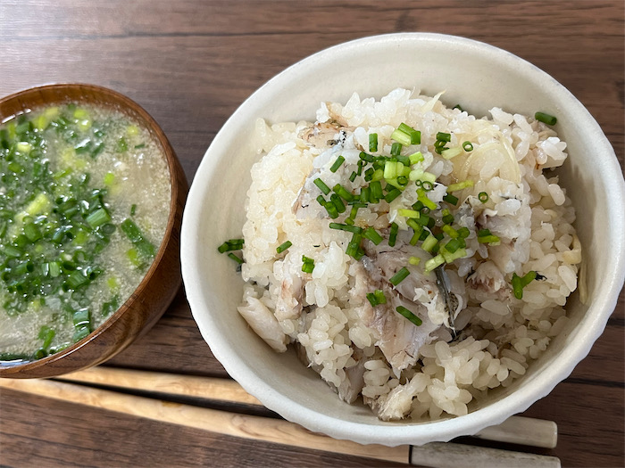 ◆「カマスの土鍋炊き込み飯」【食材】カマス(小5尾)・白米(1.5合)・新しょうが(1片)・細ねぎ(適量)・昆布いりこ合わせ出汁(1.5カップ)【調味料】純米酒(大さじ2)・薄口醤油(大さじ1)・塩麹(小さじ1)・塩(少々)。