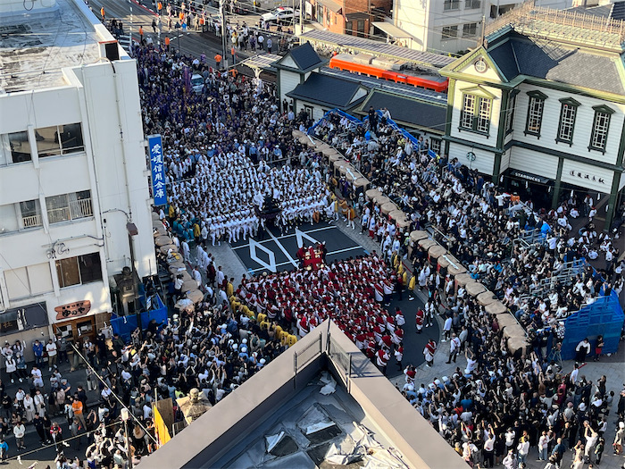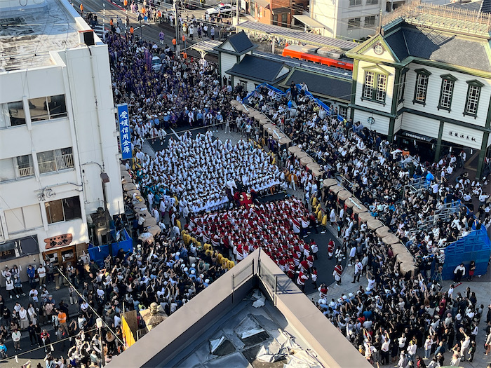 ◆夜明け前から道後温泉駅前ロータリーで宮出しした神輿が次々に鉢合わせする。ワタクシは上から見下ろすだけだが、法被姿と見物客で立錐の余地もない混雑。下にいたのではきっと何も見えないだろうなあ。鉢合わせ前の睨み合いと激突の瞬間。