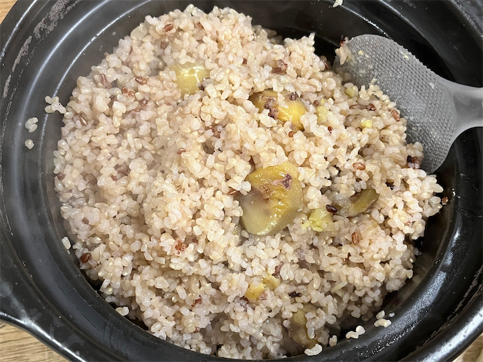 ◆今夜の〈みなか食堂・つくば本店〉は栗の雑穀玄米ご飯を土鍋で炊いた。栗と雑穀入りの玄米(2合)は白米のときの二倍の昆布出汁で6時間浸水する。強火にかけて沸騰した後もそのままさらに12分ガンガン炊き続ける。火を止めて蒸らし20分。栗はやや煮崩れるかもしれないが、これはこれは味があってOK。ごま塩を振って食卓へ。