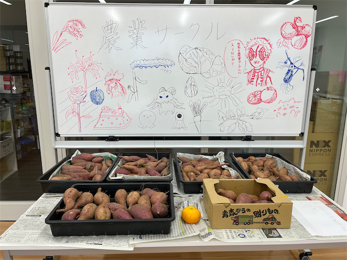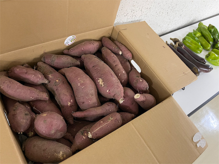 ◆構内圃場で収穫されたさつまいもが事務室前で配布されていたので、ありがたくいただいてきた。立派すぎるさつまいも。一昨日の「農業基礎演習 II」実習で収穫したと担当の先生から聞いた。