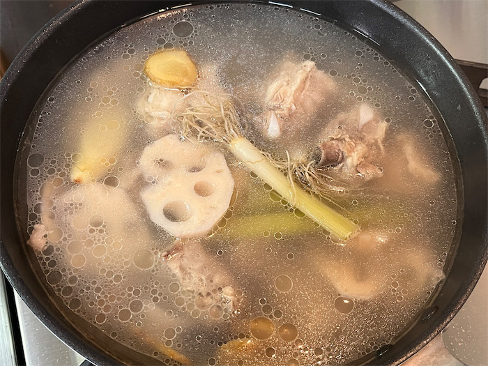 ◆明日からは急に寒くなるとの予報なので、〈みなか食堂・道後店〉ではひさしぶりに「蓮藕排骨湯」を夜明け前から仕込んでいる。豚スペアリブと蓮根をことこと煮込むだけの(時間はかかるが)お手軽なスープ。生姜をたっぷり投入する。この段階では調味はいっさいしない。