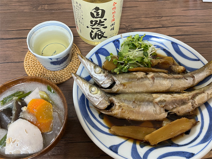 ◆今宵の〈みなか食堂・道後店〉の夜メニューは「カマスの炊いたん」。壺抜きしたカマスをそのままさっくり炊き上げる。根菜たっぷりの麦味噌汁とともにどーぞ。
