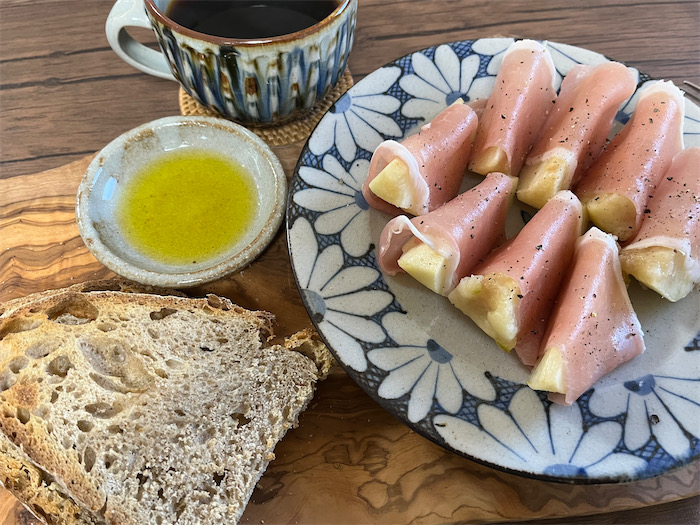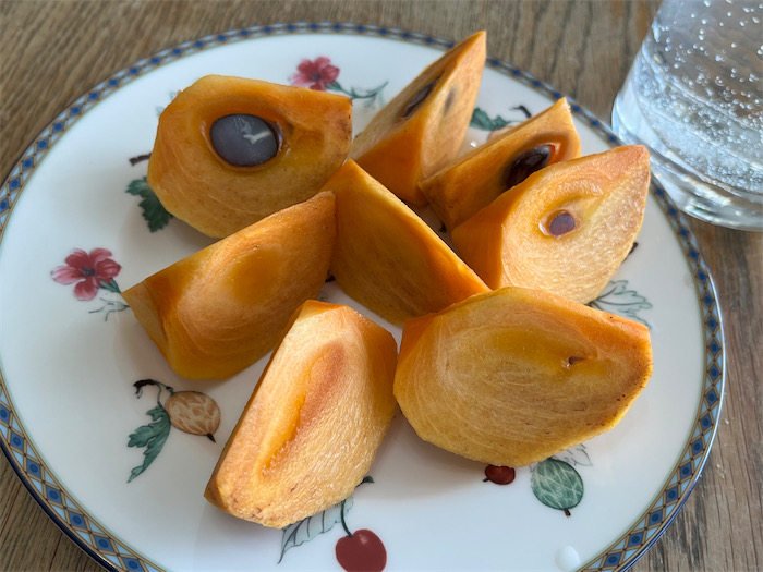 ◆昨日もらった次郎柿はもう食べ頃なので、さっそく〈みなか食堂・道後店〉の朝餉に登場。熟柿には生ハムを添えてEVオリーブオイルとともに。冷蔵保存の〈Au Goût Rustique〉カンパーニュをスライスして、バルミューダで焼けば言うことなし。いっただっきまーす!