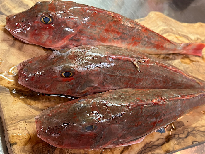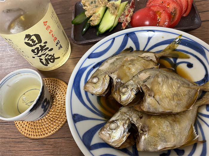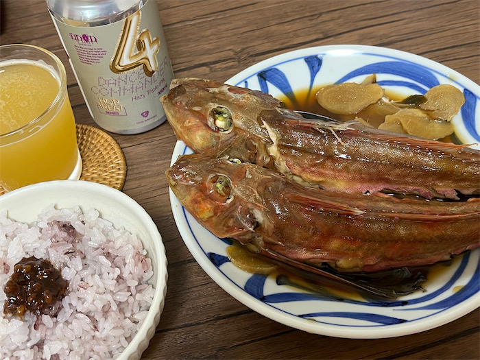 帰宅して計測したら体長20cm、重さ300gの立派なホウボウだった。いつものようにサクッと炊き上げて食卓へ。いかつい風貌に似合わずとても上品な味わい。古代米とともに。