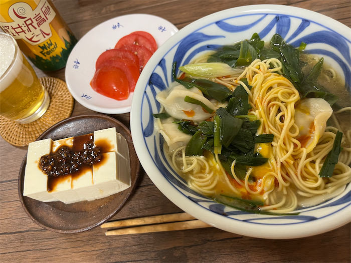◆夕方、また雷雨に降られながら足早に道後温泉街へ。今宵の〈みなか食堂・道後店〉は野菜庫や冷凍庫に残っているものの処分日。メインにあえて名付けるなら「青ねぎと水餃子とニラ玉のラーメン」。ベースは昆布といりこの合わせ出汁。そこに中華スープやらごま油やら辣油が入り混じってもうタイヘン。彩りもヘチマもない。