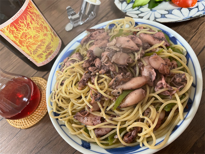 ◆夕餉には32杯でたった00円だった激安パックの水イカでパスタを用意した。
