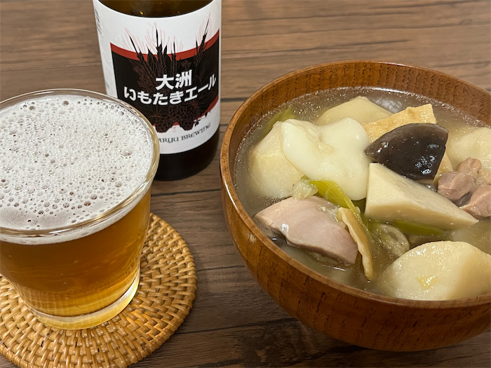 ◆「芋炊き」は愛媛のソウルフードであり、秋になるとどこのスーパーでも芋炊きの故郷・大洲の里芋が大売り出しされる。今宵の〈みなか食堂・道後店〉は「芋炊き」に初挑戦。食材は里芋(伊予美人)・椎茸・厚揚げ・鶏もも肉・青ねぎ・白玉粉。昆布といりこの合わせ出汁をベースにして、純米酒・三河みりん・三温糖・薄口醤油で調味。伊予風のやや甘めの味付けにして、いただきものの臥龍醸造「大洲いもたきエール」なる “出汁エール” を抜栓。ビールにもかかわらず里芋・鰹節・昆布・椎茸・生姜などほとんど「呑む芋炊き」みたいな味で、意外や意外、熱々の「食う芋炊き」とまったく違和感なくおいしい。このビールだけを呑むのは抵抗があると思うが、出汁の効いた鍋物にはバッチリかも。