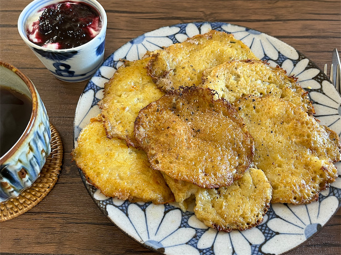 ◆昨日から “お芋” に取り憑かれている。休日の〈みなか食堂・道後店〉の朝餉はひさしぶりに「ポテトパンケーキ」を焼いてみた。薄力粉は混ぜずに卵だけをつなぎとする粗ごしじゃがいものパンケーキ。無塩バターで焼き上げる。周囲はカリッと、中はねっとりが理想。すりおろしたじゃがいもは色が変わりやすいので、手早く焼くのがコツといえばコツ。