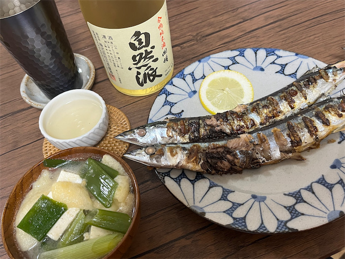 ◆今宵の〈みなか食堂・道後店〉の夕餉は北海道産生さんまの塩焼き。青ねぎ・松山揚げ・お豆腐のお味噌汁と〈開明〉合鴨純米酒「自然派」の燗酒とともに。生さんまは出回っているときに機会を逃さず食べないと後悔する。いつまでもいると思うな、親と秋刀魚。