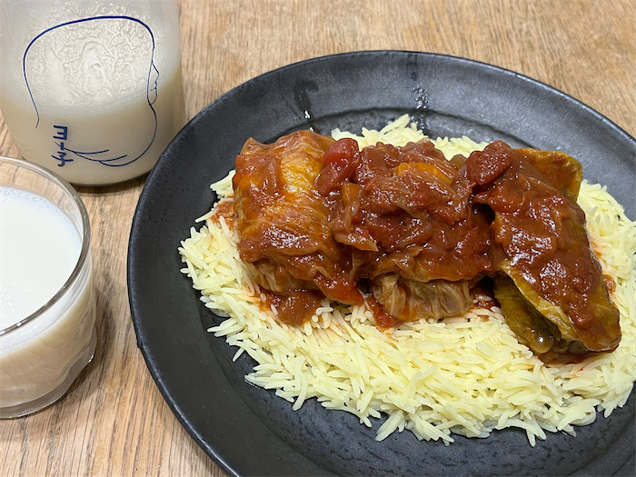 ◆毎度毎度、日が変わってからのつくば帰還。落ち葉が舞い散るセンター広場。深夜飯のメインはロールキャベツとバスマティライスの一皿。