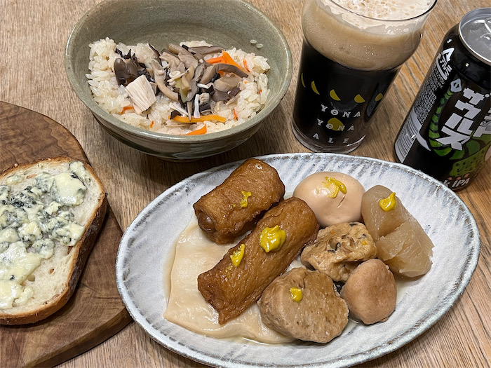 ◆午前2時過ぎの深夜飯。クラフトビールにおでんにゴルゴンゾーラ・トーストに山菜ご飯という組み合わせは何ですねん。このあとさらに蒸し上げた豚まんと燗酒が出てくる。深夜飯にはきっと「秩序」とか「節操」というものがないのだろう。