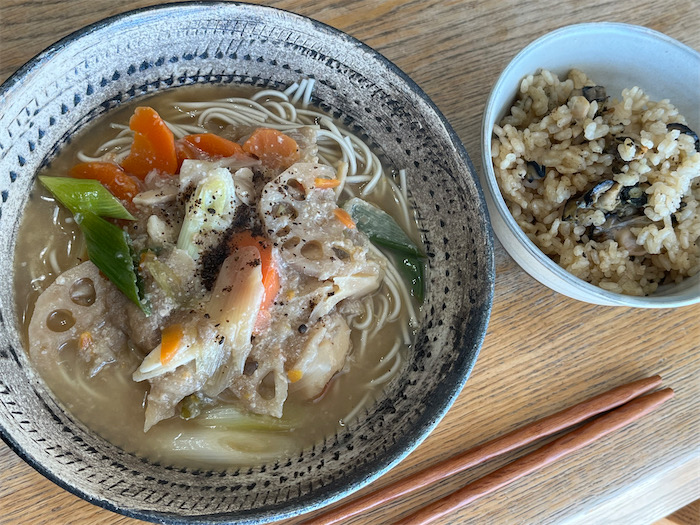 ◆昼下がりの午後1時には17.0度と昨日と同じくらい暖かくなった。午前中の用事をすませて、昼のまかないはけんちん蕎麦と牡蠣ご飯。どちらも昨夜の残りもの。