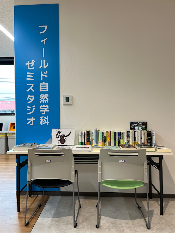 ◆〈みなか文庫〉開設 —— 松山道後キャンパス3号館3Fのフィールド自然学科ゼミスタジオ前に「新刊コーナー(みなか文庫)」を設置しました。生物系・自然系の新刊や出版前の近刊を中心に陳列していますのでどうぞごらんください。今朝、試しに椅子を置いてみましたのでお気軽に。本は現物を手に取ってみて初めて読む気になります。学科学生は借り出し自由です。
