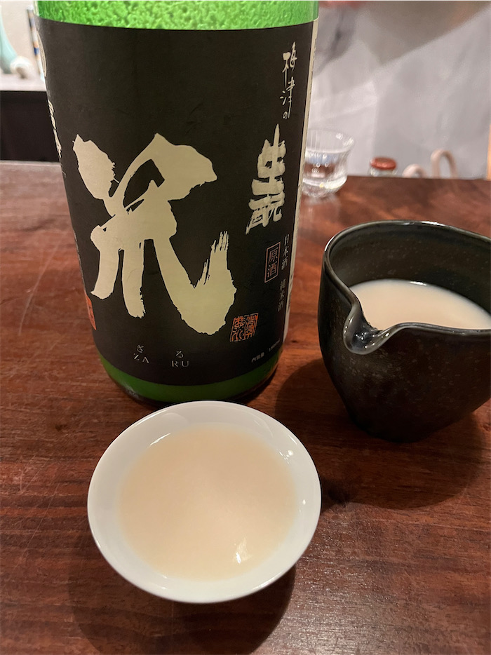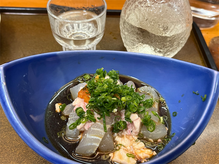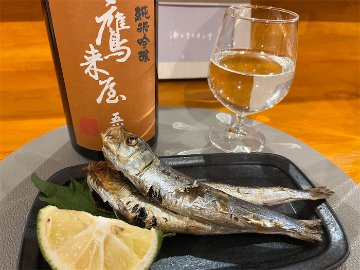 ◆今日のメインは〈大和田鮨〉。ここは予約しないと入れない人気店になってしまった。まずはカワハギの生肝あえを〈一の井手〉純米吟醸とともに。