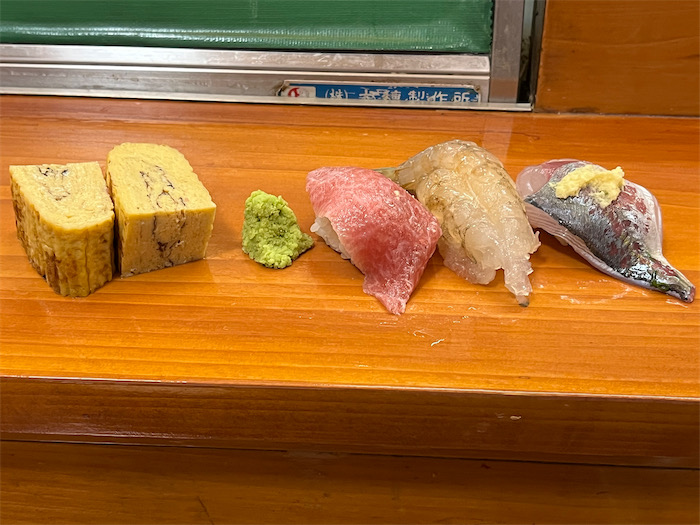 次は、関あじ・関さばのお造りを〈鷹来屋〉純米吟醸で。そして最後に地魚にぎりを。満足満腹。