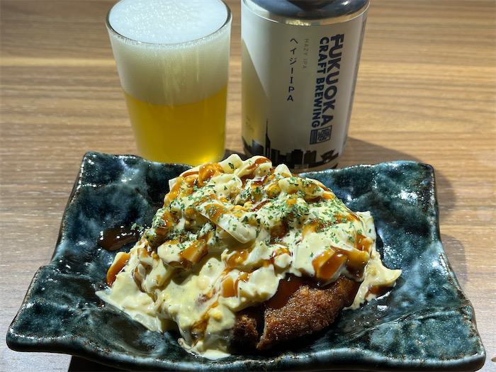 ◆ガード下にリニューアルオープンした〈べっぷ駅市場〉の雰囲気がガラッと変わっていた。〈湯煙食堂〉にて「ジャンボ椎茸メンチ」を注文。想像以上のサイズ。福岡のヘイジーIPAクラフトビールとともに。