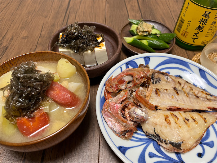 ◆夕方まであれこれ┣┣" を征伐して夕暮れの帰還。今宵は同僚の先生にいただいた静岡は清水のキンメの開きをメインに、最近定着した昆布&スルメイカの出汁で根菜の麦味噌汁を用意した。香川産の「生海苔」がうまいよとの耳寄り情報を得たので、いつもの業務スーパーに直行。真水で塩抜きしてから冷奴と味噌汁にトッピング。香りが別格。