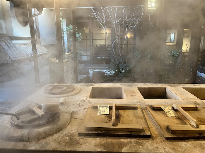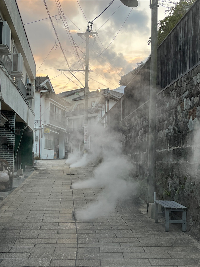 ◆湯気に巻かれる鉄輪温泉。定宿の〈柳屋〉の内湯から始まって、近くの「すじ湯」、川沿いの「谷の湯」を一廻りしてきた。