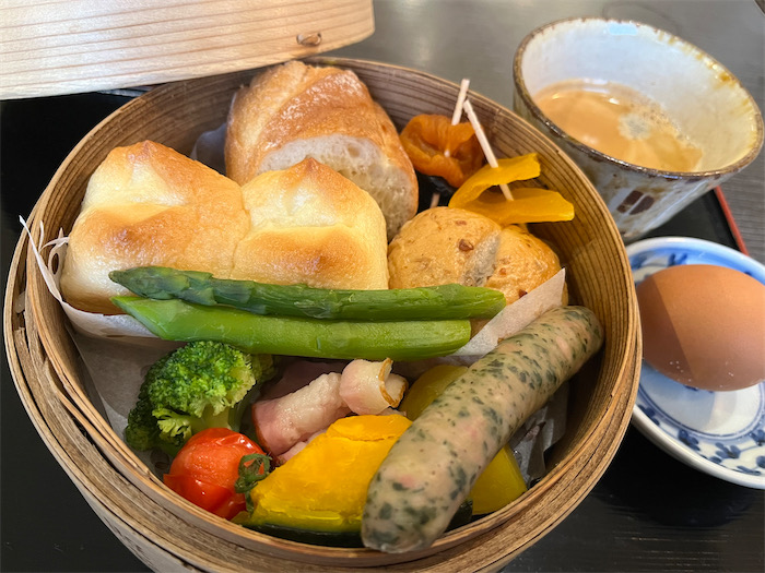 ◆〈柳屋〉の朝餉。今朝は洋風の地獄蒸しだった。