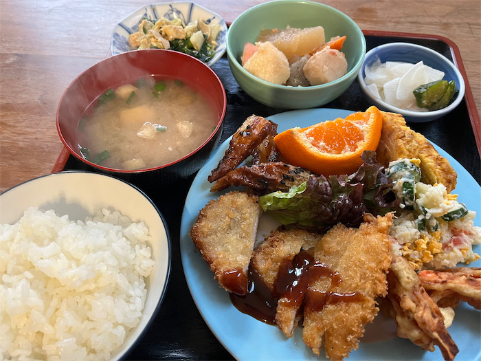 ◆早めの晩ごはんは卯之町近くの〈やすい食堂〉にて。女将さんがひとりで切り盛りしていた。カツライスを注文したら、どう見ても主菜より副菜の方が多い。しかもお芋の天ぷらやコーヒーが後出しで追加された。これで800円とは。