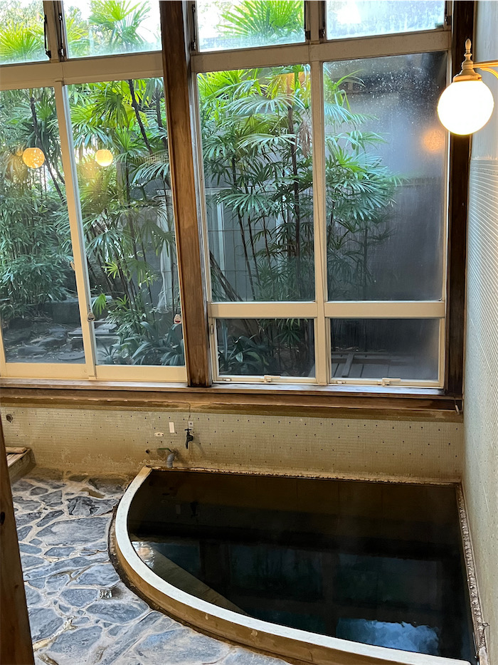 ◆別府北浜の〈べっぷ野上本館〉をチェックアウトして大分市へ。この旅館は炭酸水素塩泉のかけ流しで、洗い場の析出物が洗濯板みたいに波打っていた。素泊まりで一泊4,000円という安さは魅力。竹瓦温泉至近というロケーションもよし。