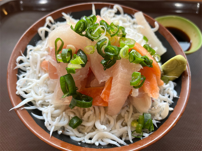 ◆旅をすれば腹が空く。フェリーターミナルの隣りに、道の駅〈八幡浜みなっと〉がある。市場直営〈どーや食堂〉で「まかない海鮮丼(大)」を。