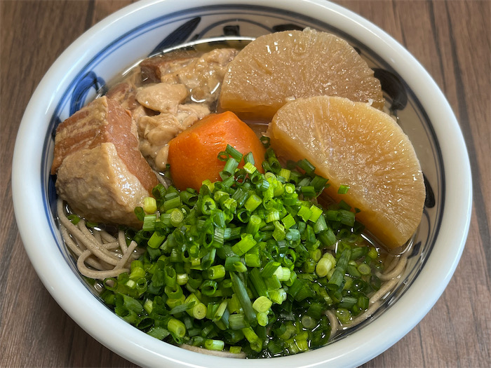 ◆帰宅後、和風ポトフの土鍋に火を入れる。昆布&いりこスープがたっぷりあるので、熱々の蕎麦に仕立てて朝餉の食卓へ。ホネ付きのスペアリブではなく、おとなしめの豚バラ肉をトッピング。この具材なら「越後そば」を投入するのではなく、「沖縄すば」にすべきだったかも。