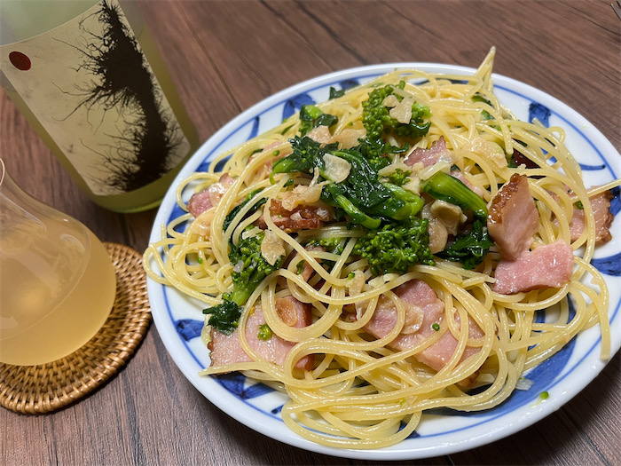 ◆夜になっても暖房不要。今日の夕餉は春らしく「菜の花パスタ」をつくった。エミリア・ロマーニャの〈Maria Bortolotti〉の微発泡にごり白ワイン「La XII Notte Falestar vino bianco frizzante」とともに。