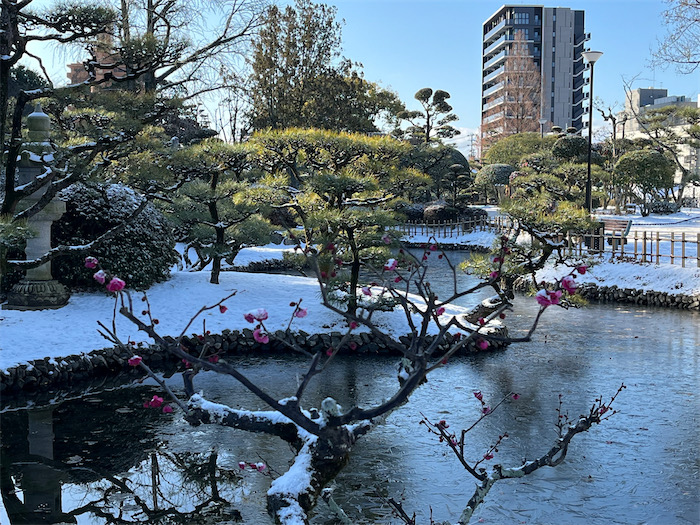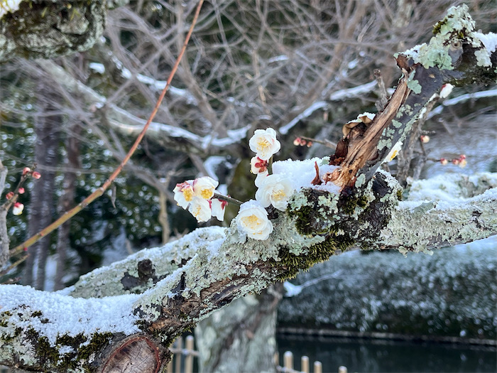 ◆出勤前に雪景色の道後公園をひとまわり。お堀はかちかちに凍結し、散策路も昨夜降ったままの雪がそのまま凍りついていた。雪だけではなく、霰もそのまま残っている。咲き始めたばかりの梅の花が雪に震え上がっている。